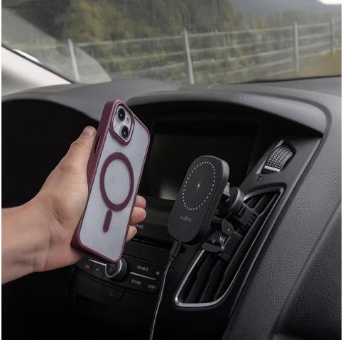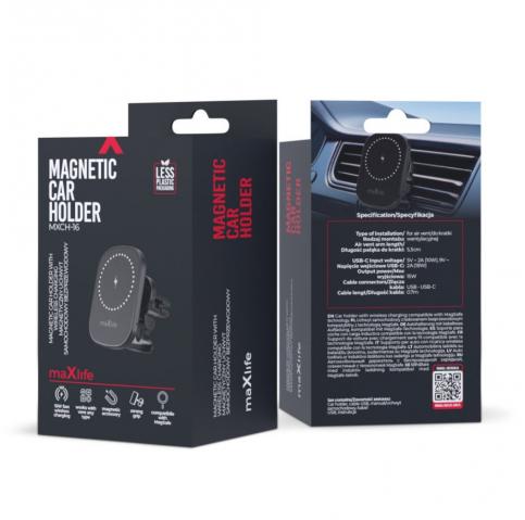 Стойка за кола за парното Maxlife MXCH-16 с безжично зареждане. Съвместима с технологията MagSafe и разполага с 15W бързо зареждане.Стойката предлага пълно завъртане на 360 градуса, което позволява удобно използване за навигация.